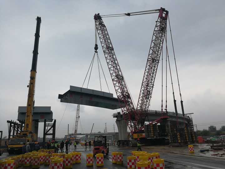 ??? 11月9日,工程順利實(shí)現跨越京臺高速鋼箱梁吊裝,完成了整座高架橋最關(guān)鍵的節點(diǎn)施工。京臺高速是我國南北交通要道,車(chē)流量非常大,封閉交通影響很大。集團領(lǐng)導靠前指揮調度,成立工作小組,工程部、材料設備部和分公司分工協(xié)作,工程部負責方案落實(shí)和現場(chǎng)調度,材料設備部負責大型吊車(chē)的聯(lián)系,洽談和督促進(jìn)場(chǎng),分公司負責同高速的對接及現場(chǎng)準備。為確保吊車(chē)能按時(shí)進(jìn)場(chǎng),集團部室帶領(lǐng)分公司科室人員兵分兩路,奔赴淄博、廊坊兩地,采取蹲地協(xié)調督促的辦法,確保了650噸、500噸履帶吊按時(shí)到場(chǎng)。同時(shí)積極與高速、路政、交警等多個(gè)職能部門(mén)溝通協(xié)調,先后進(jìn)行了5次吊裝方案專(zhuān)家論證、10余次方案推演,最終將吊裝作業(yè)時(shí)間由原定5.5小時(shí)壓縮至不到4小時(shí),將高速通行影響降到最低,圓滿(mǎn)完成吊裝作業(yè)任務(wù)。