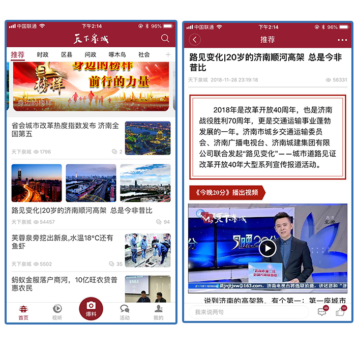??? 其中,順河高架專(zhuān)題視頻獲新華社、人民日報等網(wǎng)絡(luò )客戶(hù)端轉發(fā)。目前,新華社客戶(hù)端已突破100萬(wàn)人閱讀。本次系列宣傳活動(dòng)自11月開(kāi)始至12月底結束,將推出15期系列專(zhuān)題視頻,以“人、事、路”為載體,通過(guò)全面展現濟南市交通建設成就勾勒出改革開(kāi)放40年濟南市城市發(fā)展的輝煌歷程。