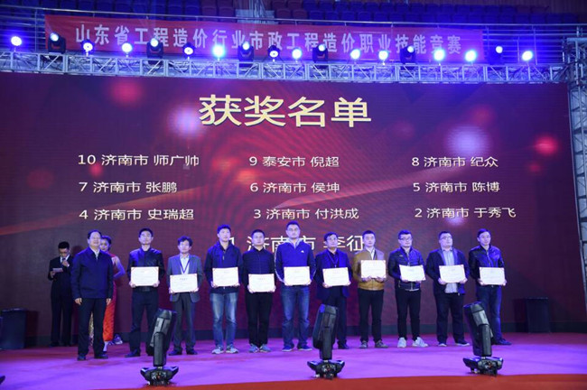 ??? 第一名獲得者李征獲“山東省富民興魯勞動(dòng)獎?wù)隆?,第三名付洪成、第四名史瑞超、第七名張鵬、第八名紀眾獲“山東省工程造價(jià)市政專(zhuān)業(yè)技術(shù)能手”榮譽(yù)稱(chēng)號。
