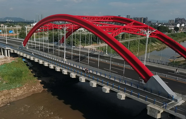 ??? 宣城宛陵路東段工程造價(jià)1.61億元,為城市主干路,全橋共計六聯(lián)18跨,其中主橋跨徑100米,采用下承式鋼管混凝土系桿拱橋。道路全長(cháng)920米,紅線(xiàn)寬度56米,高架段路幅寬度31米(主橋38.2米)。