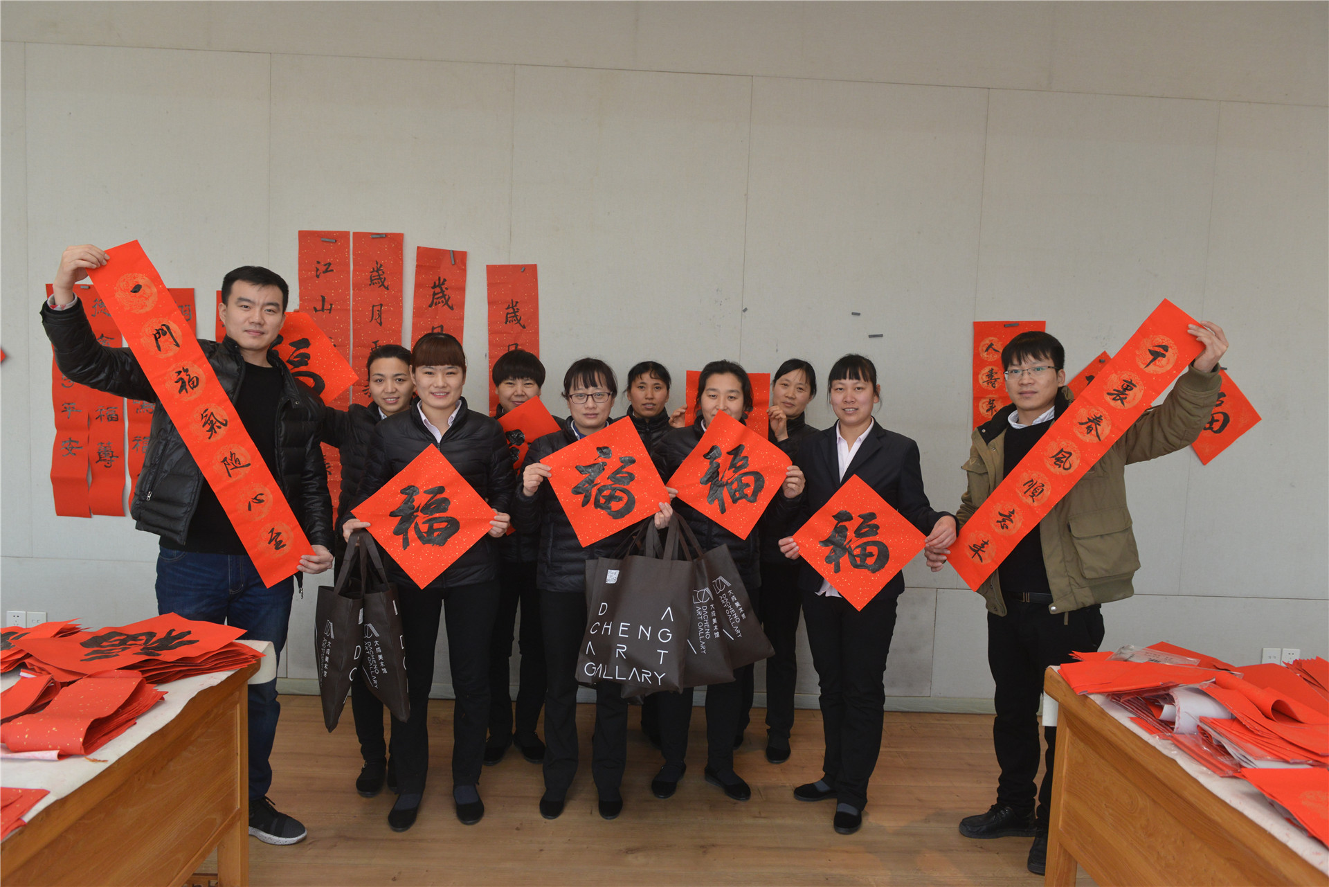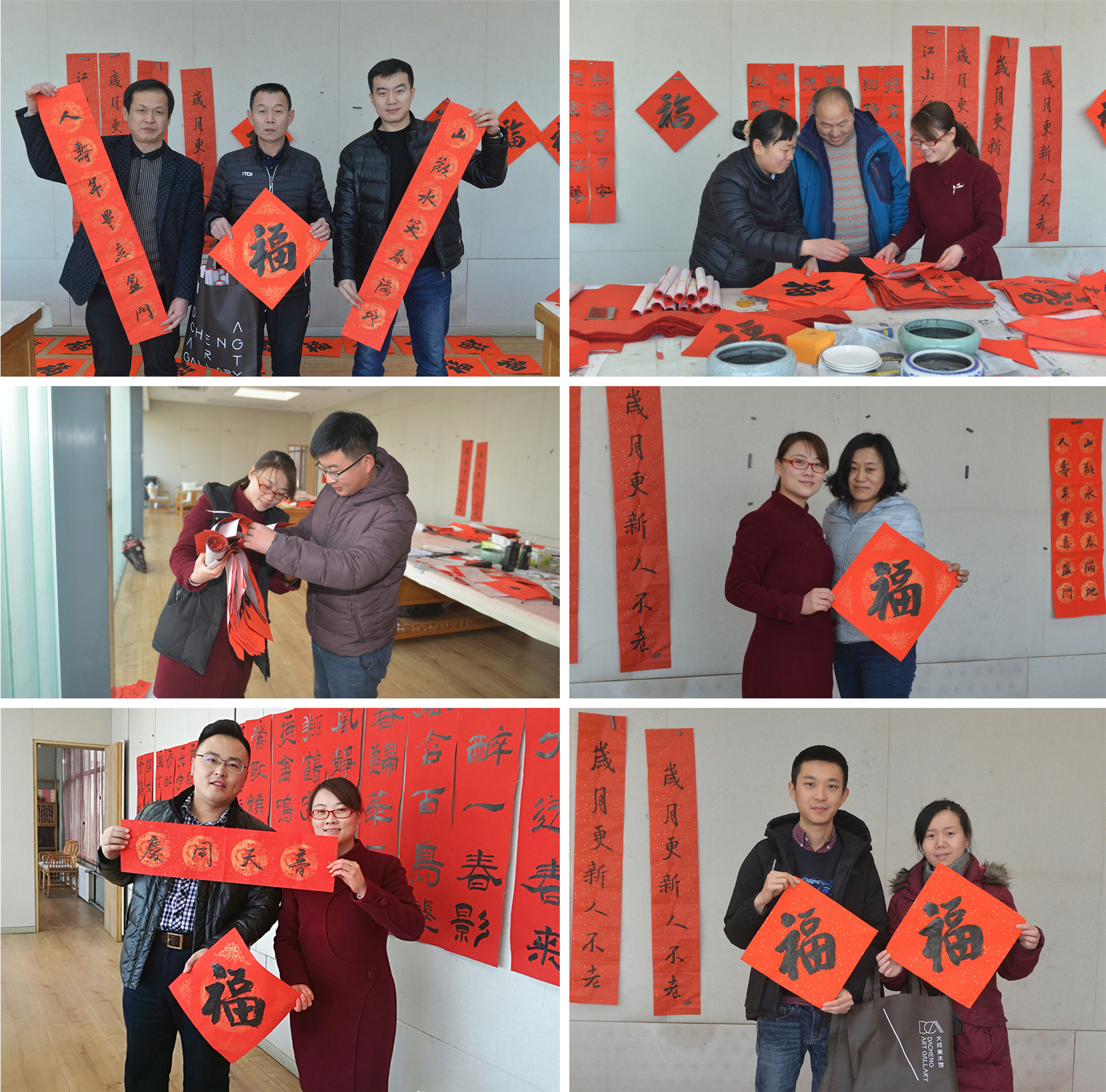 ??? 與此同時(shí),“過(guò)新年?送祝?!睂?xiě)春聯(lián)公益活動(dòng)也在美術(shù)館五樓如火如荼地開(kāi)展著(zhù)。該活動(dòng)受到了集團職工的廣大好評,各單位職工紛紛預約領(lǐng)取春聯(lián)。截止目前為止,寫(xiě)春聯(lián)活動(dòng)進(jìn)行了半月有余,送出對聯(lián)千余幅,福字六千余張,一幅幅寓意美好的春聯(lián)、福字將集團廣大干部職工最真摯的新年祝福帶到施工一線(xiàn),帶給在祖國各地的家人們。