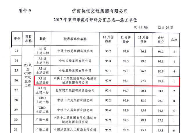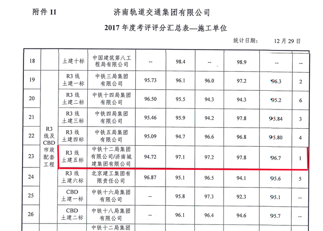 ??? 近日,由二分公司承建的濟南軌道交通R3線(xiàn)一期土建施工五標段項目,在濟南軌道交通集團組織的2017年第四季度暨年度考評中獲得雙第一,這是在集團的高度重視和大力支持下,項目全體職工群策群力、拼搏奮戰的成果。目前,R3線(xiàn)五標王舍人車(chē)站現已完成車(chē)站主體封頂,王—裴區間右線(xiàn)已完成掘進(jìn)900環(huán),左線(xiàn)完成掘進(jìn)600環(huán),目前正在進(jìn)行區間風(fēng)井端頭加固施工。在新的一年里,項目部將再接再厲,再創(chuàng )佳績(jì)。