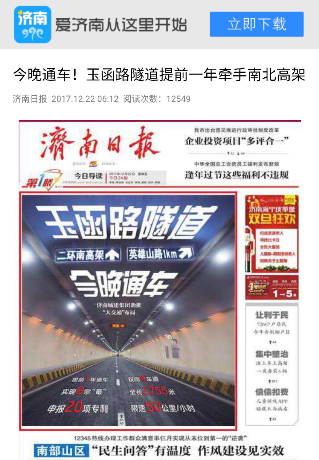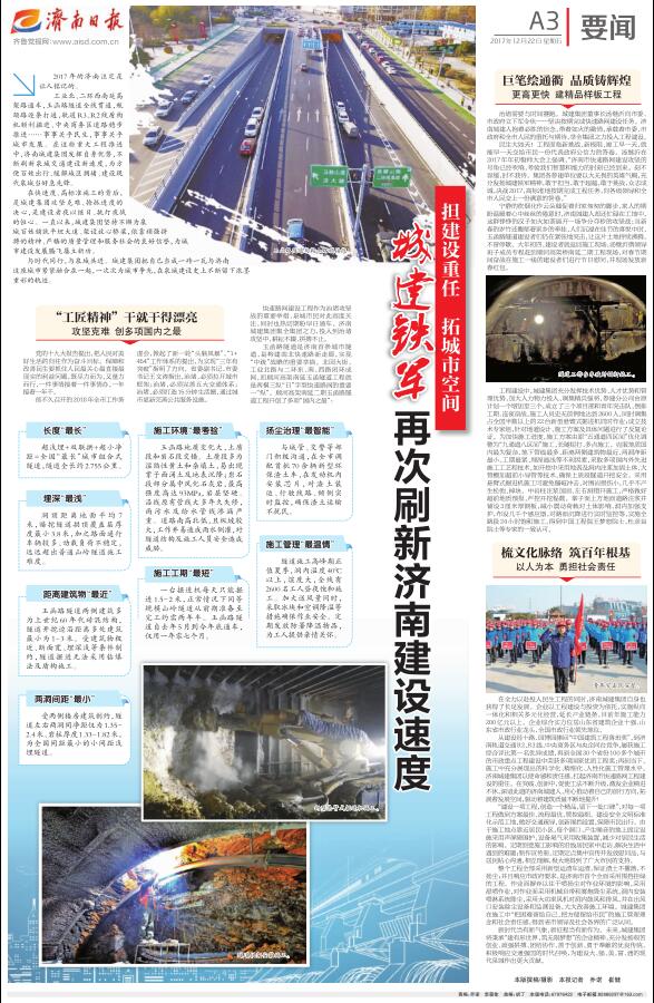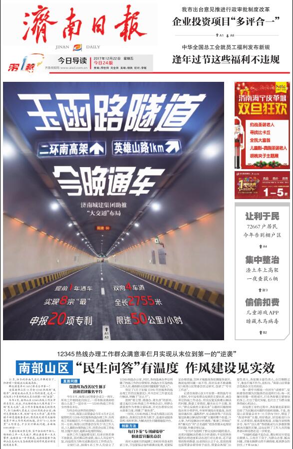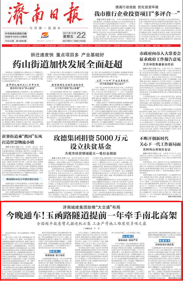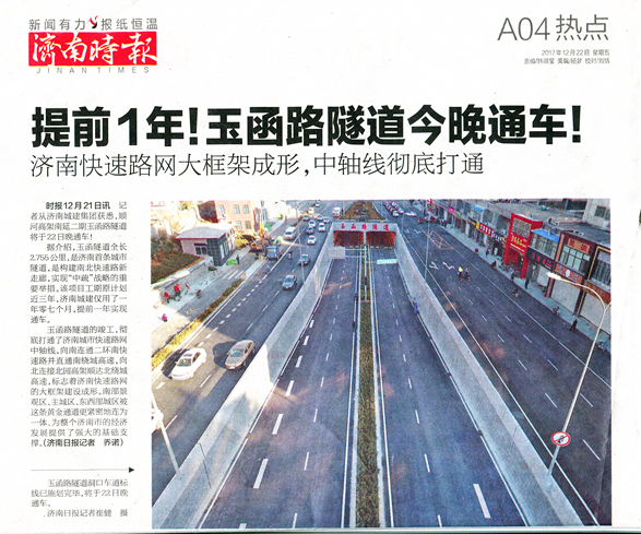 ??? 12月22日,《濟南日報》封1、頭版、A3版以“玉函路隧道今晚通車(chē)!濟南城建集團助推‘大交通’布局”“今晚通車(chē)!玉函路隧道提前一年牽手南北高架”“擔建設重任 拓城市空間 城建鐵軍再次刷新濟南建設速度”為題,報道了集團承建的順河高架南延二期玉函路隧道工程通車(chē)新聞,對集團發(fā)揚城建鐵軍精神,以大無(wú)畏的英雄氣概,敢于擔當,敢于超越,敢于挑戰,眾志成城,決戰2017,提前一年高標準地完成玉函路隧道工程建設任務(wù)給予高度評價(jià)。濟南時(shí)報等報刊,愛(ài)濟南、齊魯晚報、濟南城市建設集團等網(wǎng)絡(luò )平臺也對玉函路隧道通車(chē)進(jìn)行了報道。