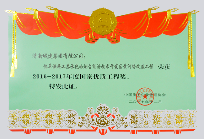??? 集團施工總承包的煙臺經(jīng)濟開(kāi)發(fā)區黃河路改造工程被授予“國家優(yōu)質(zhì)工程獎”。國家優(yōu)質(zhì)工程獎設立于1981年,是工程建設領(lǐng)域設立最早、規格最高,跨行業(yè)、跨專(zhuān)業(yè)的國家級榮譽(yù)獎勵,旨在弘揚“追求卓越,鑄就經(jīng)典”的國優(yōu)精神,充分發(fā)揮示范引領(lǐng)作用,大力推進(jìn)質(zhì)量強國建設,是我國工程建設質(zhì)量方面的最高榮譽(yù)。