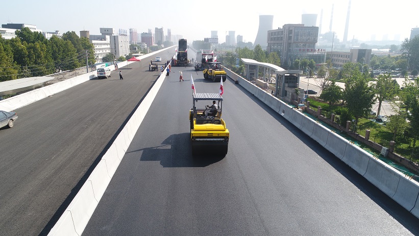工業(yè)北路高架橋瀝青攤鋪施工進(jìn)行中