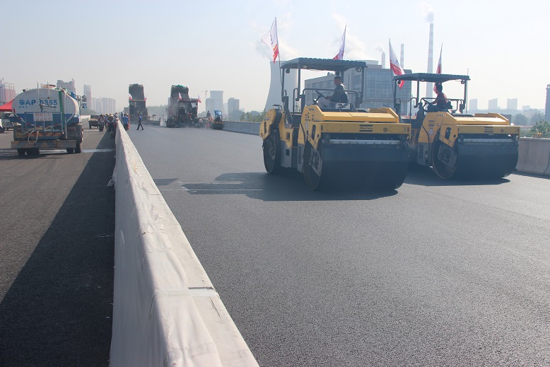 ??? 本次瀝青攤鋪共分三層,分別采用AC-5、SMA-13、SMA-10瀝青砼,攤鋪厚度分別為2、4、4厘米,每層面積約22萬(wàn)平方米。由于此次攤鋪時(shí)間緊、任務(wù)重、作業(yè)線(xiàn)長(cháng),攤鋪?lái)椖坎考暇闪α?,不等不靠,主?dòng)出擊,調集2個(gè)攤鋪隊伍全力以赴投入戰斗,為工程順利進(jìn)行提供了堅實(shí)的人力、物力保障。施工過(guò)程中重點(diǎn)加強對現場(chǎng)的管理和抽檢力度,合理安排施工工作面,嚴格控制運輸、攤鋪和碾壓等各道工序,質(zhì)檢人員隨時(shí)跟進(jìn),及時(shí)檢測攤鋪溫度、厚度等符合技術(shù)要求,各部門(mén)上下聯(lián)動(dòng)、密切配合,圓滿(mǎn)完成高架橋主線(xiàn)瀝青攤鋪任務(wù)。