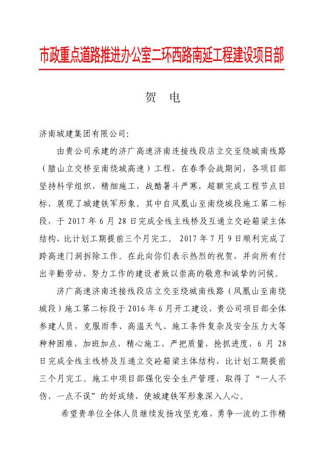 ??? 繼集團承建的濟南軌道交通R3線(xiàn)一期土建施工五標段施工榮登濟南軌道交通集團R3線(xiàn)2017年6月份暨第二季度考評榜首并獲得建設單位發(fā)文祝賀后,7月14日,市政重點(diǎn)道路推進(jìn)辦公室二環(huán)西路南延工程建設項目部發(fā)來(lái)賀電,對集團超前完成濟廣高速濟南連接線(xiàn)段店立交至繞城南線(xiàn)路(鳳凰山至南繞城段)工程節點(diǎn)目標表示祝賀,向全體參建員工表示崇高的敬意和誠摯的問(wèn)候。