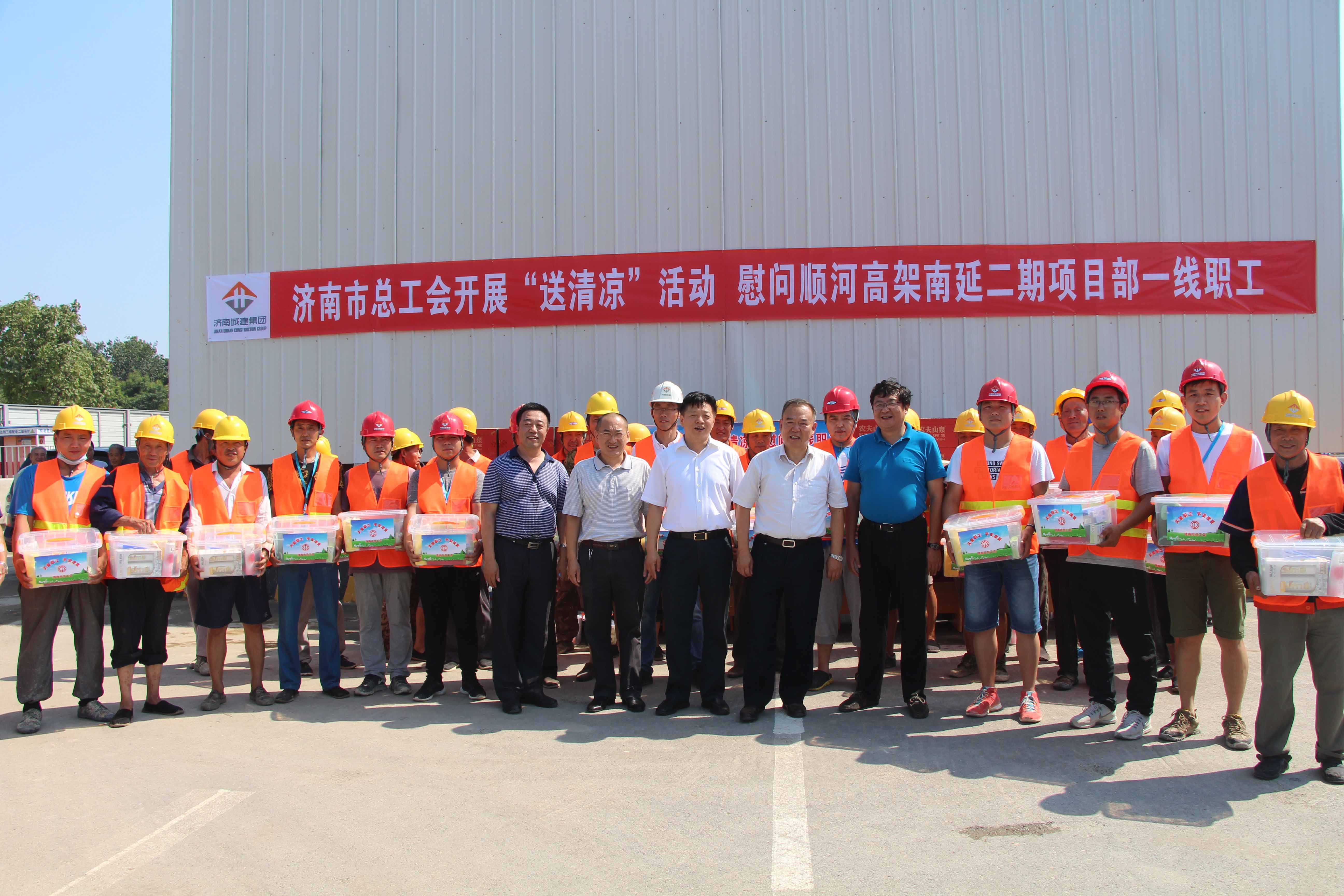 ??? 7月12日下午,濟南市人大常委會(huì )副主任、市總工會(huì )主席孫積港,市總工會(huì )副主席傅金峰、李興家,保障部部長(cháng)周延慰問(wèn)集團順河高架南延二期項目職工。集團黨委副書(shū)記、總經(jīng)理牟曉巖,工會(huì )主席、總經(jīng)濟師朱相波陪同。